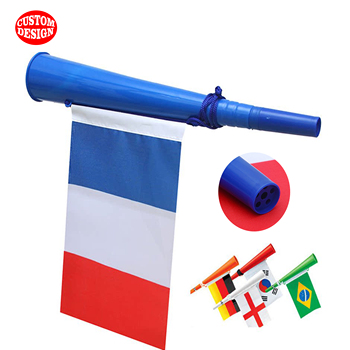 Venta al por mayor de diseño personalizado fabricante de ruido de plástico deporte juego de fútbol cuernos de juguete con Bandera de País